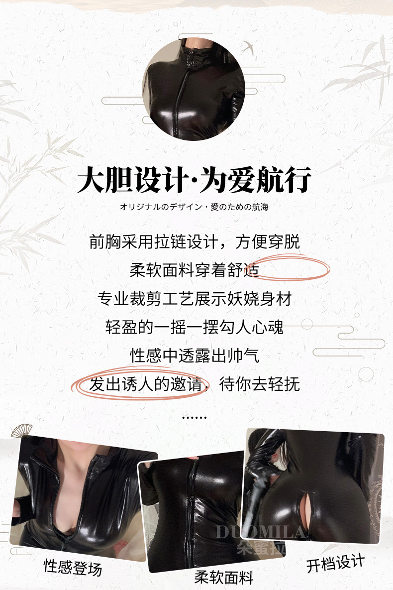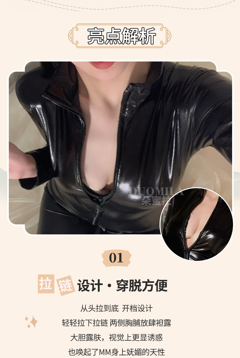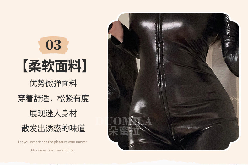 全身紧身设计包裹曲线,漆皮拉链材质打造出视觉强烈的性感效果。适合作为情趣服饰或成人用品中增温穿搭选择。